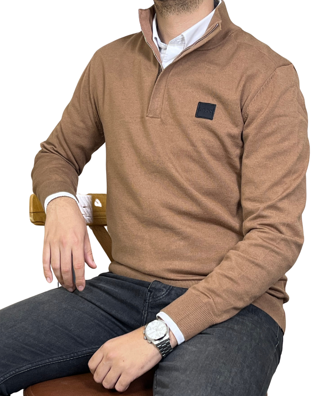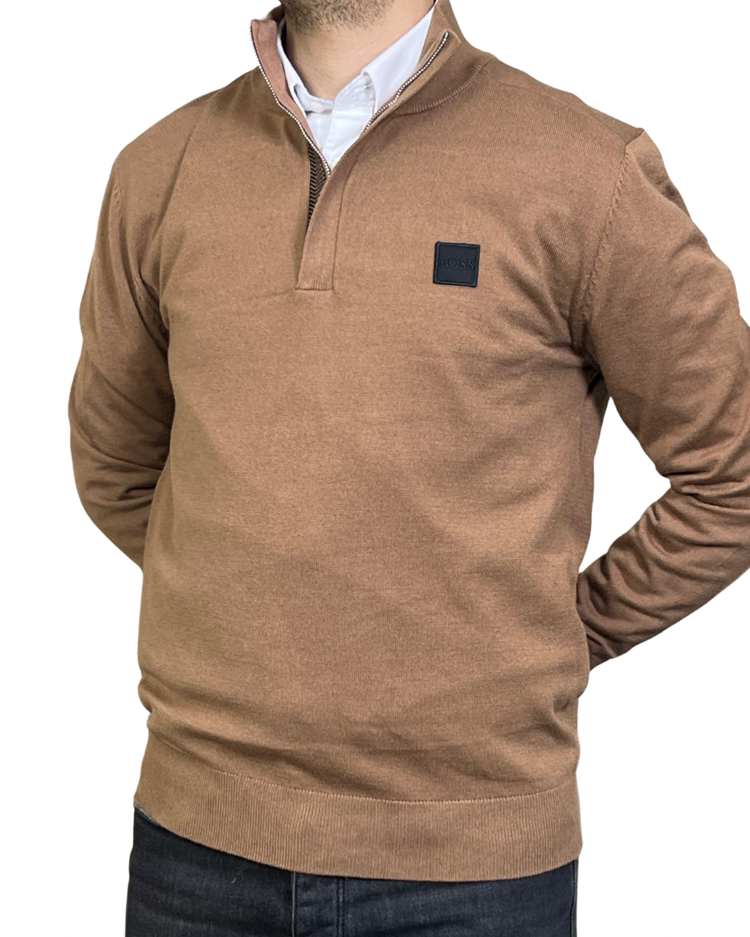 Pull demi-zip BOSS en beige camle profond avec logo brodé ton-sur-ton. Un essentiel propre et professionnel, idéal pour le travail comme pour les sorties.