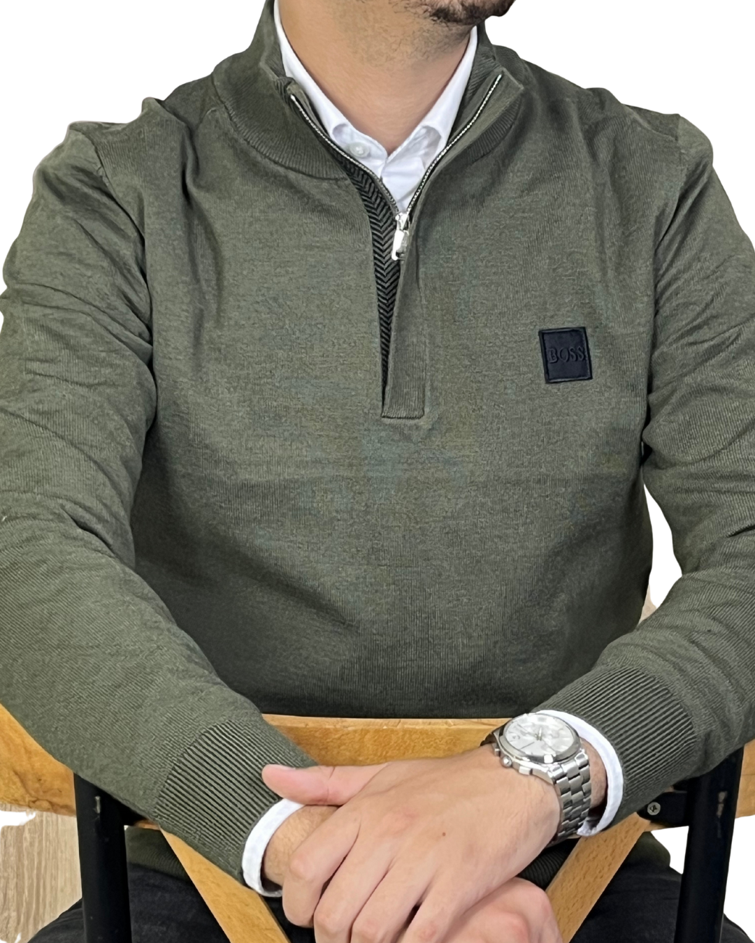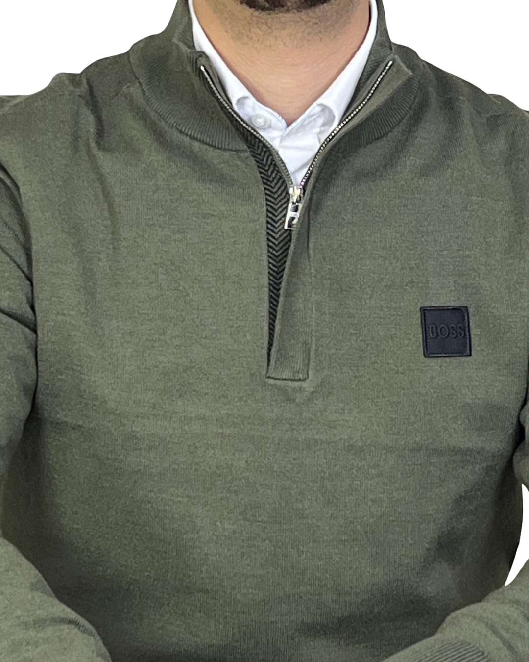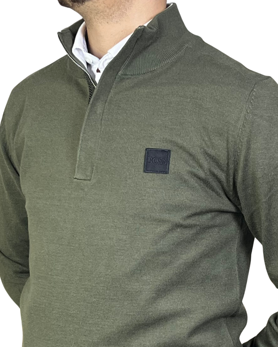 Pull BOSS 100% coton avec col demi-zip et logo brodé. Couleur kaki tendance, parfait pour un look propre et élégant au quotidien. Se porte facilement avec une chemise ou un jean.