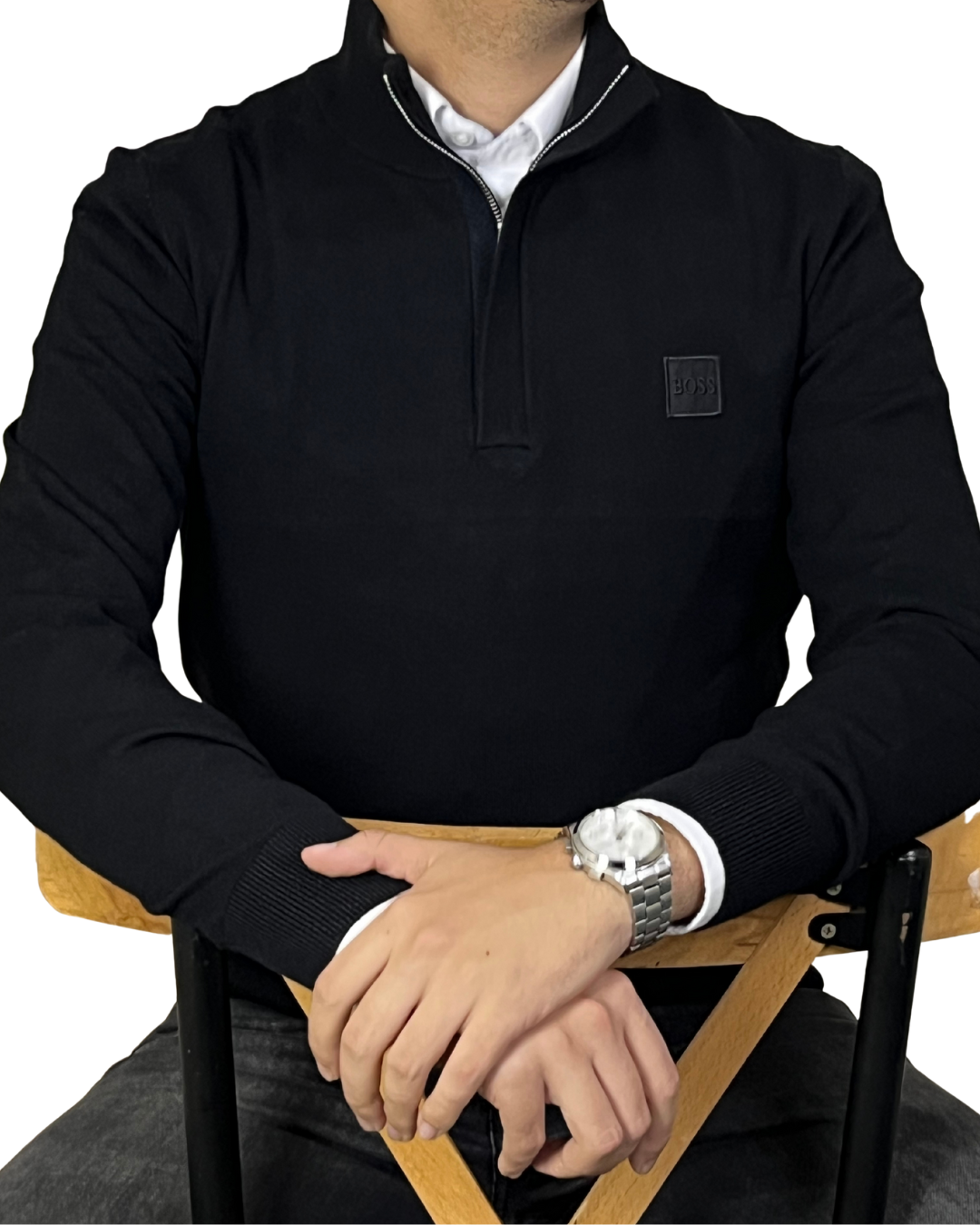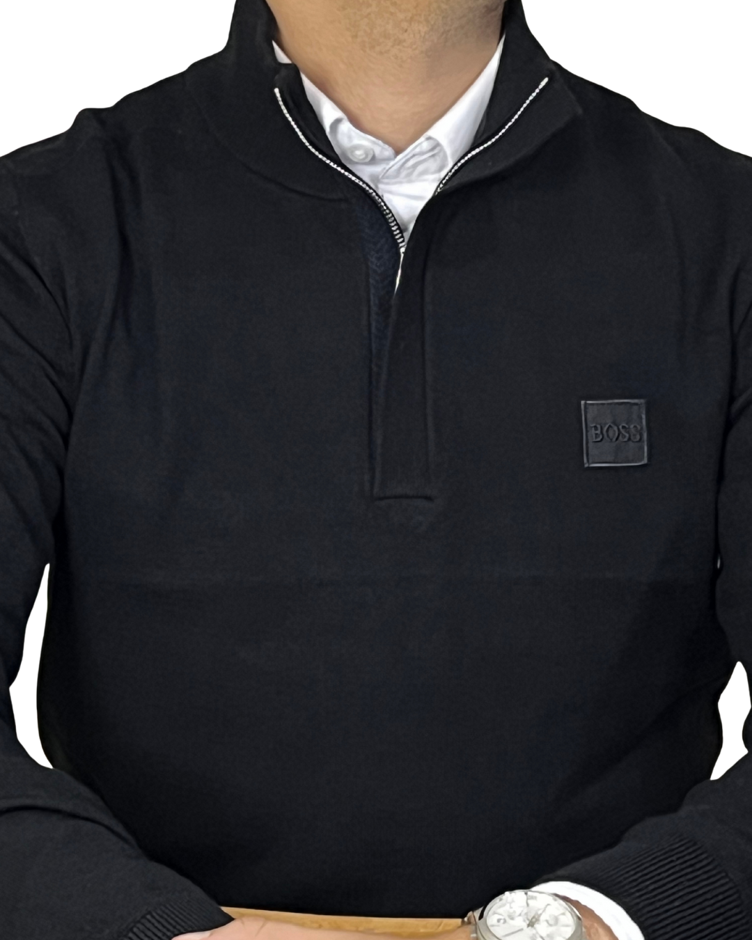 Pull demi-zip BOSS en noir profond avec logo brodé ton-sur-ton. Un essentiel propre et professionnel, idéal pour le travail comme pour les sorties.